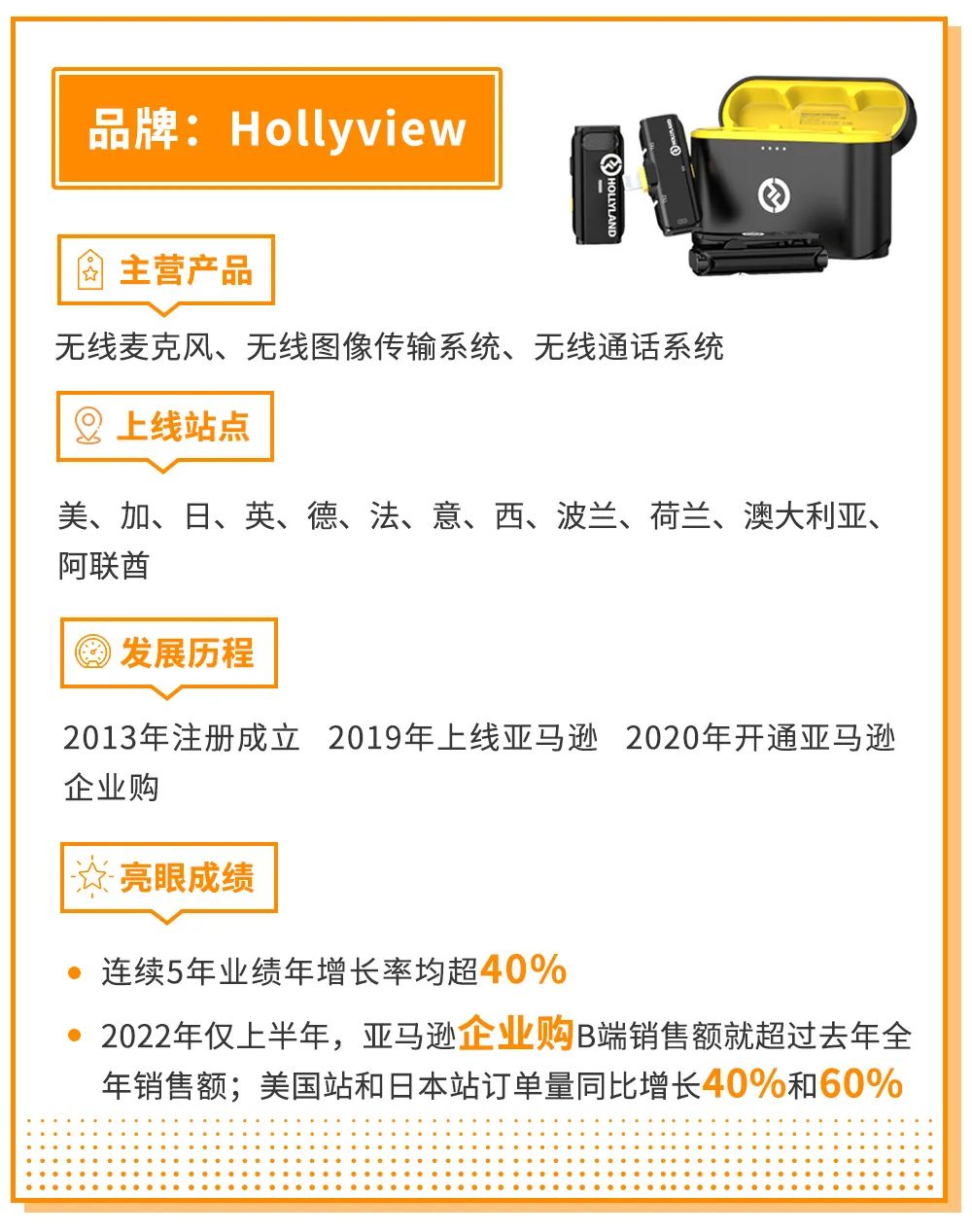 从出师不利到柳暗花明,厚积薄发之下,Hollyview实现了连续5年40%以上的业绩增长。在2022年上半年,B端销售额就已超过去年全年销售额,在美国站和日本站订单量也同比增长40%和60%。