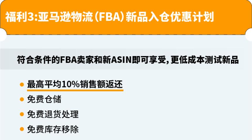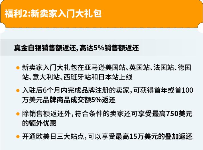 亚马逊全球开店:针对新品牌所有者的品牌销售额,新卖家入门大礼包中的5%返还将会首先生效,卖家可在享受新卖家入门大礼包的5%的销售额返还之后,再通过亚马逊物流新品入仓优惠计划享受其中的新选品销售额(平均10% )返还:对于完成品牌注册的品牌所有者,对符合要求的亚马逊物流(FBA)新父ASIN销售额将按月获得5%的销售额返还。