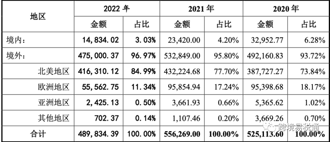 据招股书披露,赛维时代境外销售收入占比较重。2020年 ~2022年,公司境外销售收入分别为49.22亿元、53.28亿元和47.50亿元,占营业收入的比例分别为93.72%、95.80%和96.97%,以北美地区和欧洲地区为主,其中北美地区的销售占比超80%。 目前,公司销售渠道主要为 Amazon、Wish、eBay、Walmart 等第三方电商平台以及 SHESHOW、Retro Stage 等垂直品类自营网站,线上营销网络覆盖美国、德国、英国等多个国家和地区。 报告期内,公司第三方电商平台销售收入占主营业务收入的比重分别为79.03%、90.26%及 93.06%,是公司主营业务收入的最主要来源。其中,Amazon销售收入占比报告期内呈现逐年增长的趋势,2022 年占主营业务收入的比达88.93%,为第三方电商平台中最大的销售渠道,也是公司“品牌化”运营的主要平台。 多渠道、泛铺货、低价强攻,是赛维十年来立足海外市场的根本。赛维时代不同于此前上市的Anker,Anker的跨境商业模式难以复制;而赛维代表了大多数的跨境电商企业,赛维时代成功上市,将给跨境企业带来新的希望。