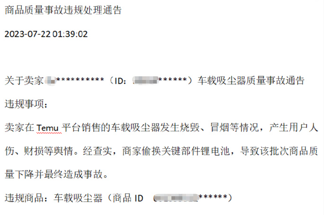 面对竞争愈发激烈的市场环境,缺乏先赋性优势的Temu已然意识到,仅凭“极致低价”难以达到理想的预期,转而开始着手于关注商品的质量。AMZ123获悉,7月22日凌晨,多个卖家收到了来自Temu的商品质量事故违规处理通告。据爆料,此次被群发通告的产品以及其违规事项主要有以下三种:1、车载吸尘器偷换关键部件锂电池,导致该批次商品质量下降并最终造成烧毁事故;2、256G内存卡容量存在严重虚标、以次充好卖家存在制假售假行为;