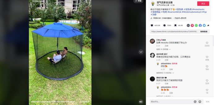 在6月26日TikTok博主“@airlandolists”发布的一条关于户外伞蚊帐的视频,该视频播放量达2000万播放,60.3万点赞,1380条评论互动。