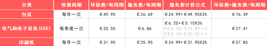 1年的法国EPR代付服务费=€24.99×使用代付服务的EPR分类数量+总代付环保费×3%。