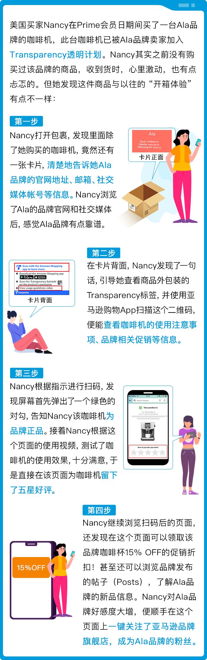 亚马逊全球开店:“符合资质的卖家,只要把商品加入Transparency透明计划,就可以为商品获得专属的条码!使用该计划的每一件商品,都会可获得一个独一无二的、带有可扫描条码的标签,卖家只需将标签粘贴在商品外包装上,提前设置好扫码落地页的内容,简单操作便可静静等待“被动营销”发酵,“躺赢”吸粉,促进复购。”