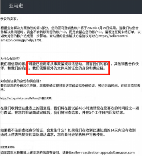 此次的视频验证亚马逊在邮件中明确指出:相关卖家账户可能被用于从事欺骗或非法活动,因此亚马逊需要额外的文件来验证该卖家的身份和供应链。