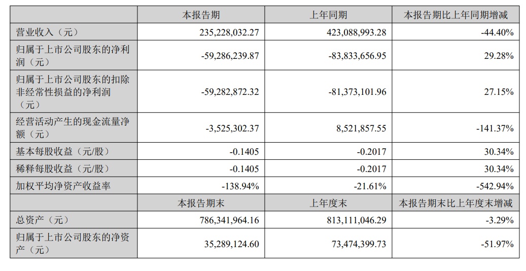 8月23日消息,ST有棵树发布2023年半年度报告。报告显示,公司实现营业收入2.35亿元,同比减少44.40%;归属于上市公司股东净亏损5928.62万元,同比亏损收窄;归属于上市公司股东的扣除非经常性损益净亏损5928.29万元,同比亏损收窄;基本每股亏损0.1405元/股。