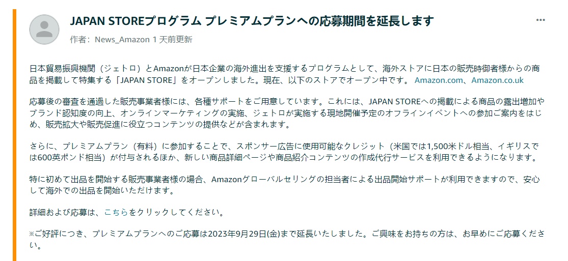 亚马逊日本站日前发布公告称,日本贸易振兴机构(JETRO)和亚马逊开设了“JAPAN STORE”作为支持日本企业海外扩张的计划,申请后通过审核的卖家通过在JAPAN STORE上架产品可以增加产品曝光度和提高品牌知名度。