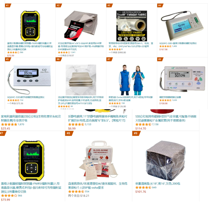 雨果跨境搜索亚马逊平台,发现核辐射测试仪也在今日冲上了亚马逊#实验室辐射防护用品BestSellers榜首,该榜单几乎被同类核辐射测试仪产品霸屏,在#危险物质处理这个大类目,核辐射测试仪也冲上了前十的榜单,位于第7位。