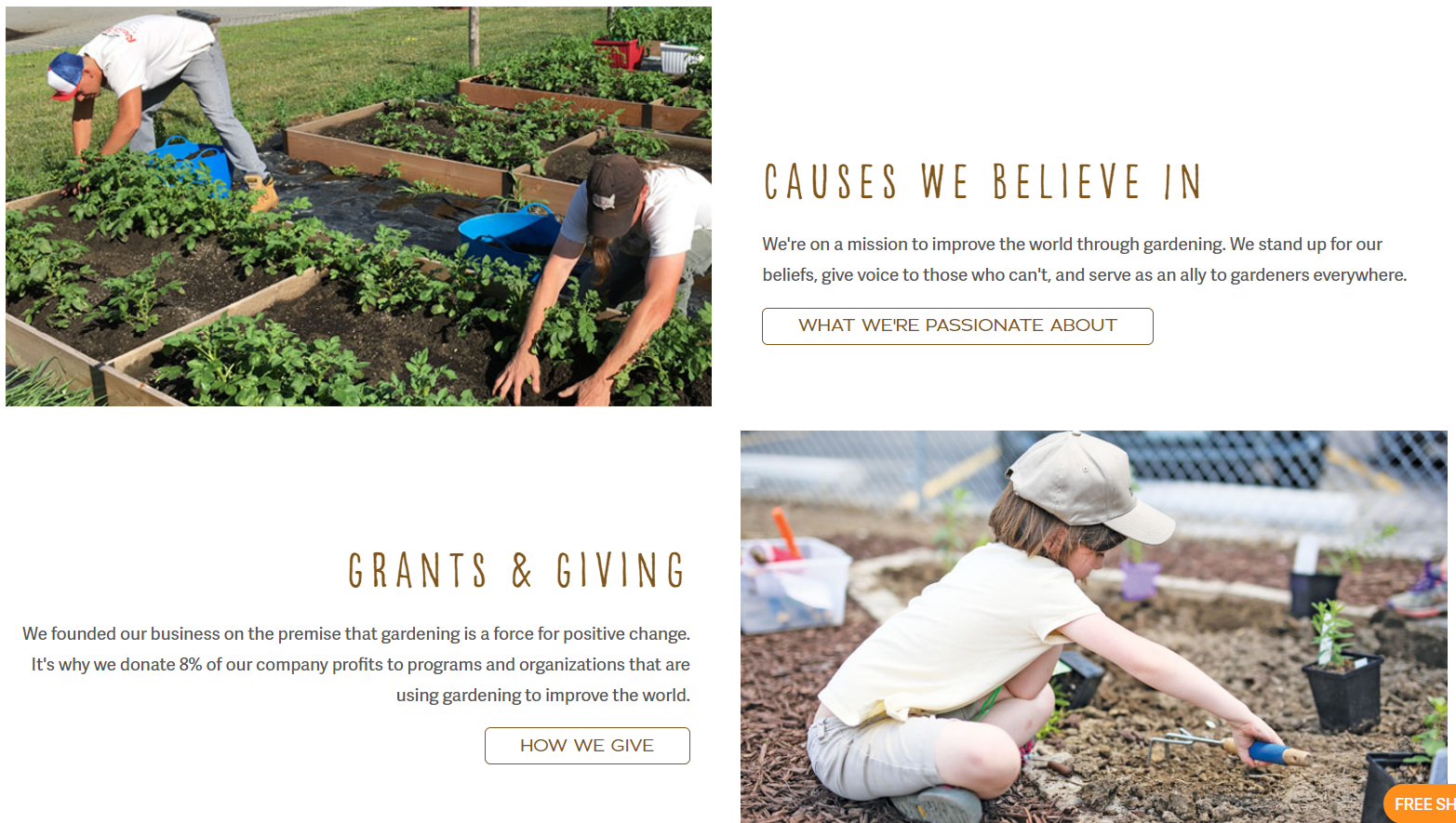 该版块表示,Gardener's Supply的使命就是通过园艺改善世界,并成为世界各地园丁的盟友;且公司会将利润的8%捐赠给园艺、可持续农业和与饥饿相关的事业。