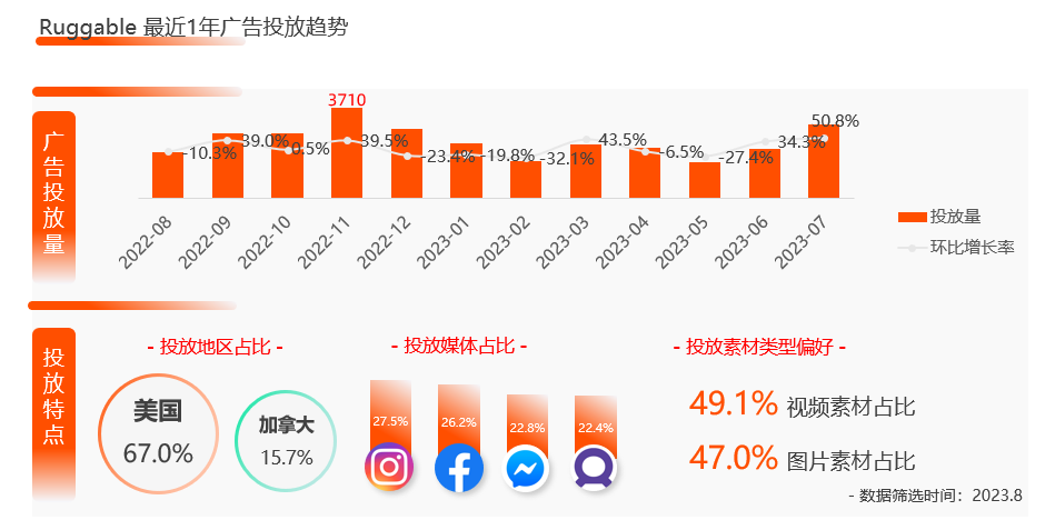 以主站点分析,Ruggable 近一年的广告投放量大且稳定。主要的投放高峰期集中在夏季和冬季,如在22年的11月,投放广告数达到3710条,环比增长为39.5%。最近来看,23年7月的投放广告数环比上升50.8%。