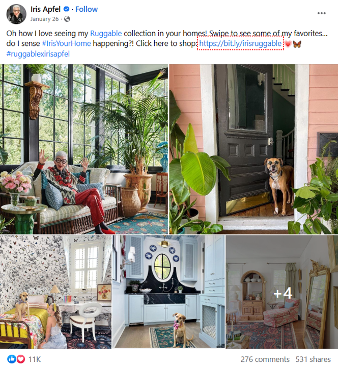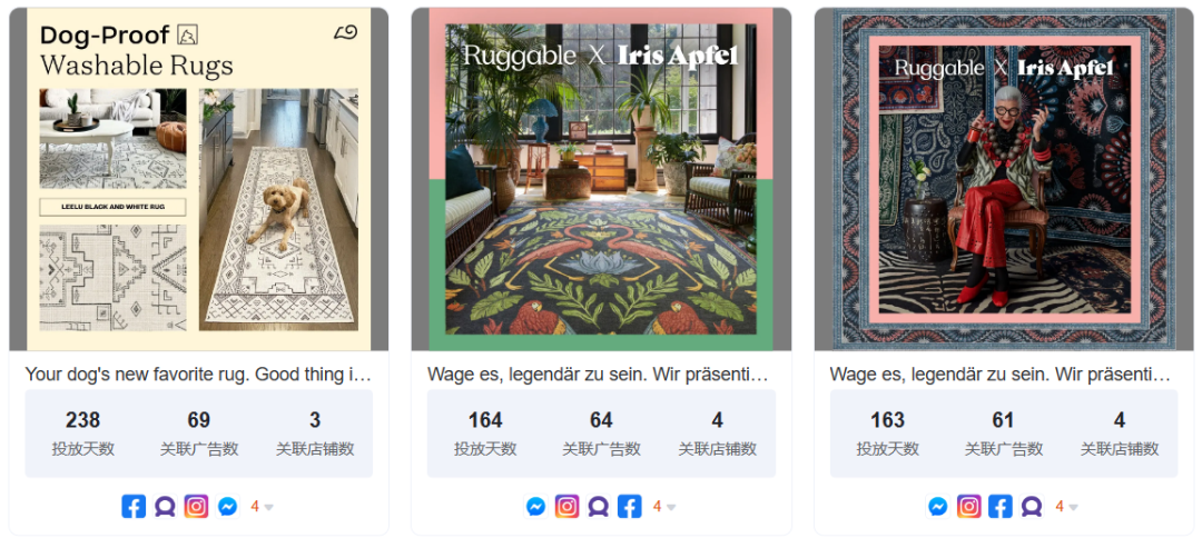 在图片素材类型中,地毯品牌 Ruggable 主要使用高清且充满生活氛围的产品展示图,这样的素材投放有利于更好地展示产品的使用场景和生活氛围,拉近与消费者的距离,增强产品的亲和力和吸引力。此外还有和 KOL 进行合作,提升品牌形象。