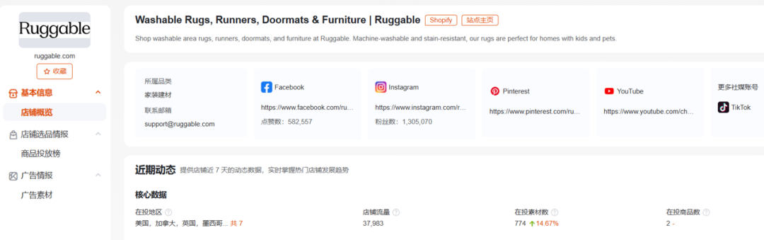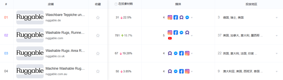从 GoodsFox 的数据来看,Ruggable 目前是针对不同地区的站点进行定向投放广告,如德国站(ruggable.de)、英国站(ruggable.co.uk)、澳洲站(ruggable.com.au),其中主站点(ruggable.com)投放的广告数最大。