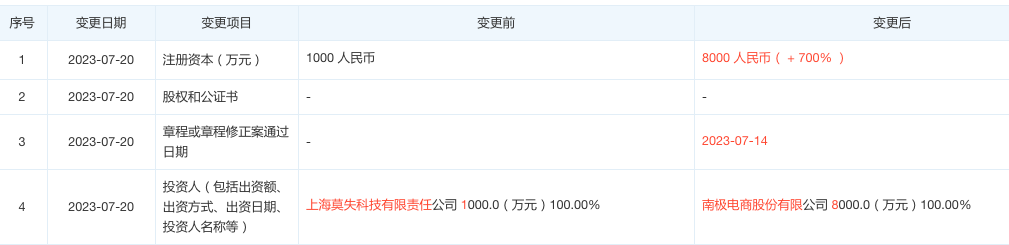今年7月份,除了注册资本,福摩斯科技还做了多项信息变更,比如投资人由上海莫失科技有限责任公司变更为南极电商股份有限公司。