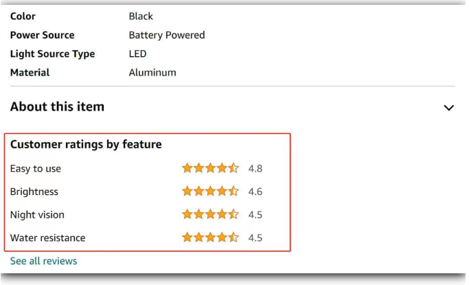就是把产品的性能、特征进行分类,细分出评分、星级等,消费者可以一眼看出此产品哪方面的性能更为突出、优秀。 这一改版直接使得评论的权重再次提高!对于卖家来说,尤其产品型卖家是利好的,但是对营销型卖家就有点影响了。亚马逊也在一步步引导告诉卖家,一切还是以产品为主。