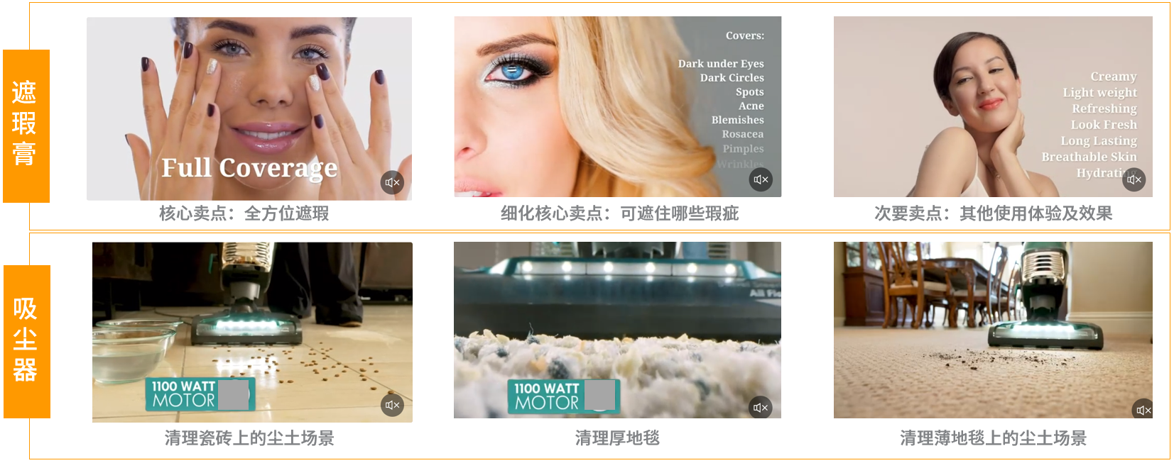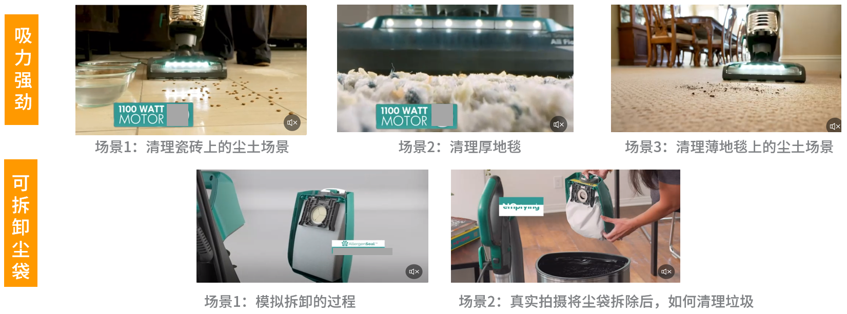 越重要的卖点展示时间越长。如:吸尘器 – 吸力强劲功能点(3个场景)>可拆卸尘袋功能点(2个场景)