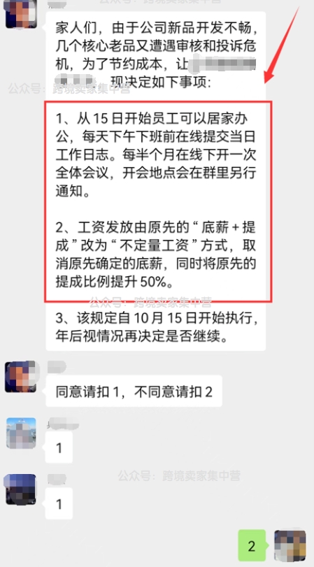 该公司之前的工资发是跨境圈通行的“底薪+提成”的方式,但是在宣布了这则居家办公的通知后,工资发放的方式也改成了现在的“只发提成”的方式。