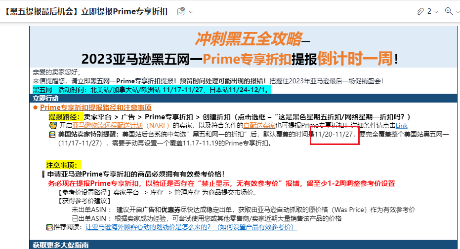 当然,如上图所示,亚马逊也给很多买家发送了相关的设置提醒。大家一定不要忽略这一点,防止错过3天的大促推广。