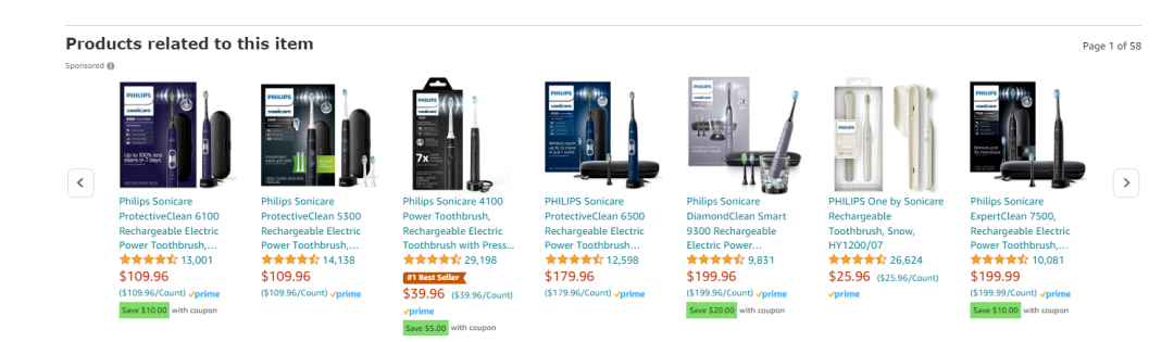 第2 , 商品页面关联流量--垂直细分同品牌同类产品互投很多买家经常发现自己的流量明明很多,但是转化率极低。很大可能就是我们的客户通过我们商品页面的各个广告位流失调整到其他竞品页面进行下单购买。如果我们做的是垂直细分领域, 我们可以拿着自己的ASIN B C D E F G H ...去定投我们的ASIN A,防止我们商品页面流量外流。比如,我们可以看到电动牙刷品类的卖家philips做的都非常到位。我们的新品可以定投到我们自己的爆款链接上,做好流量防守战。