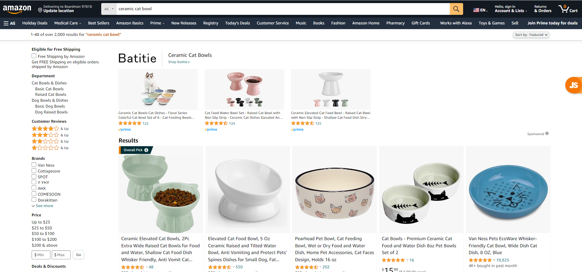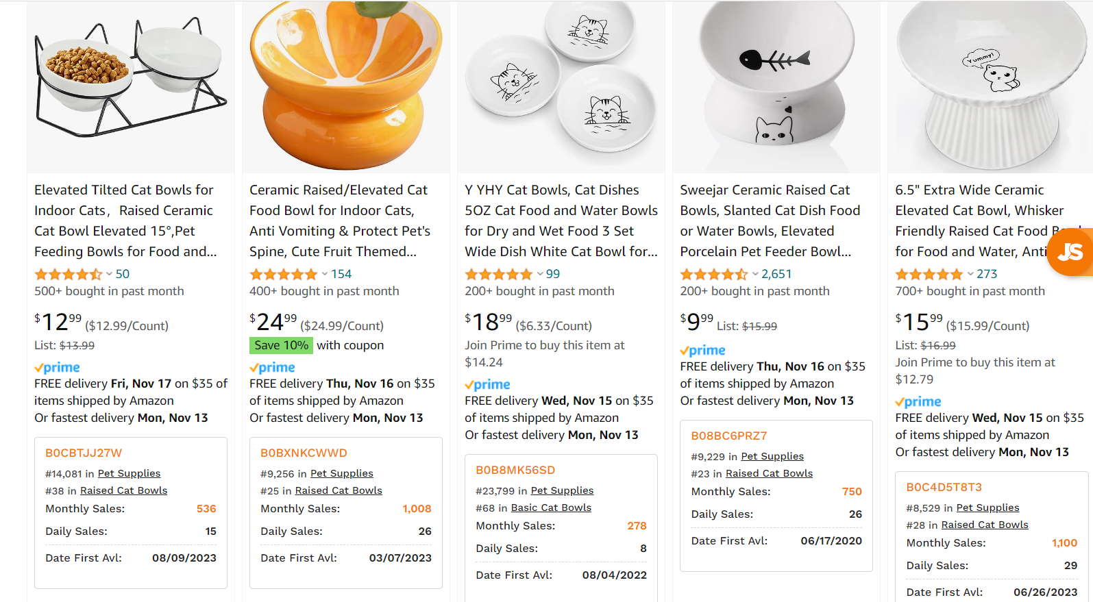 以千叶提供的截图举例,通过前台搜索关键词(例如"ceramic pet bowl")来寻找潜在产品。筛选关键词时,重点关注一年内的产品、销量超过10个,价格较高(通常在20美元以上),并具有较有创意的款式。