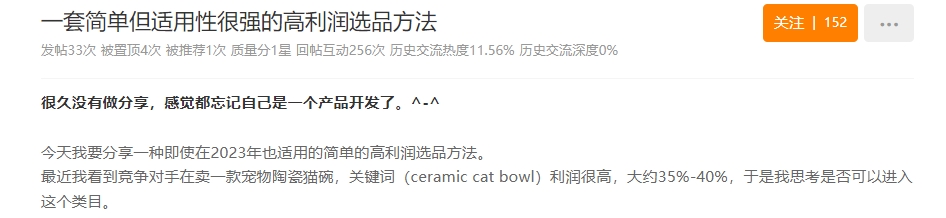近日,产品开发千叶就在论坛上发帖分享自己的选品方法: