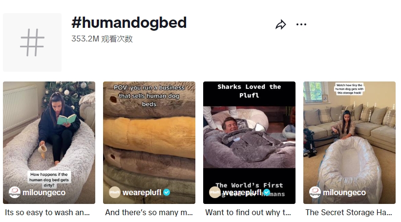 相关视频内容大多为各个品牌发布的人类狗床产品展示视频。其中,Plufl 品牌的账号@weareplufl在2022年10月发布的一条视频获得了超86万次点赞,7200多条评论。