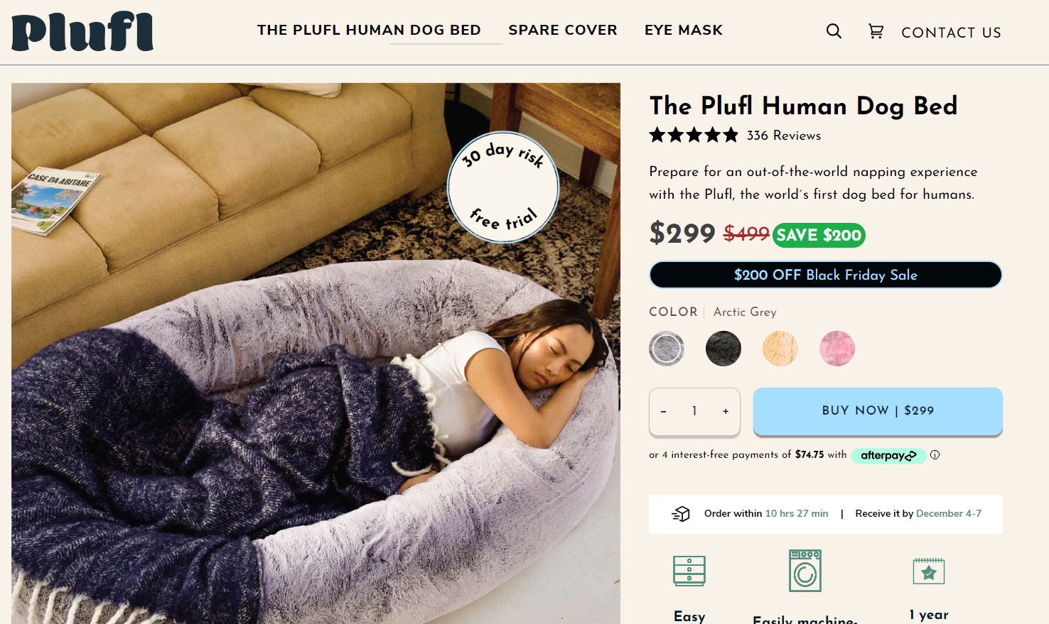 谷歌榜单中提到的Plufl 这个品牌,在宣传中自称人类狗床的发明者。目前,市面已有各种各样的人类狗床品牌。