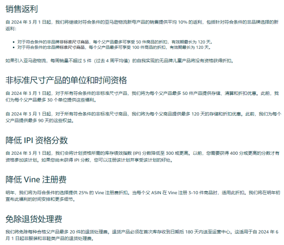 1.亚马逊物流新品入仓优惠计划:2024年3月1日(美国时间)开始,针对FBA新选品,亚马逊将提供平均10%的销售佣金返还,符合条件的非品牌选品也可以享受这个权益。同时,亚马逊将扩大大件选品参与该计划的资格范围,提供Vine产品相关福利。