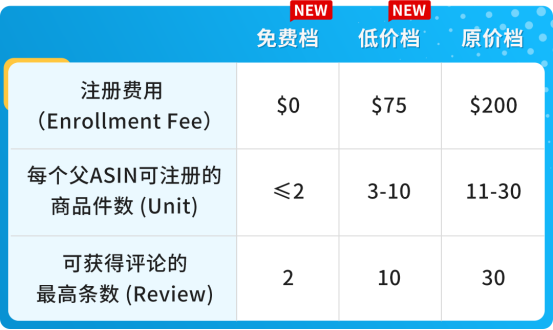 Vine计划原来的收费标准为200美元/父ASIN,从2023年10月19日起,新增了0美元和75美元两档阶梯报价,注册费用由每个父ASIN的注册商品件数决定。0元档这个羊毛你真的不薅吗?具体收费标准如下: