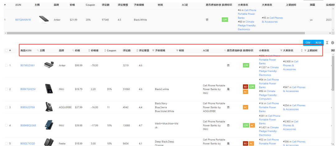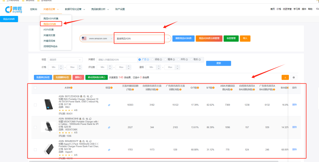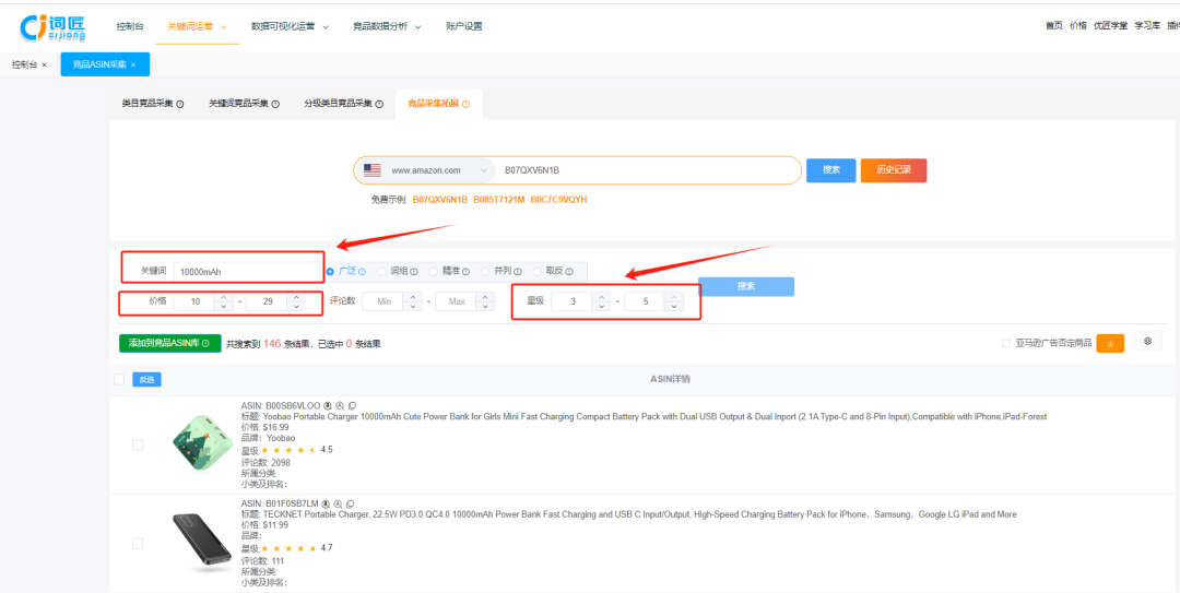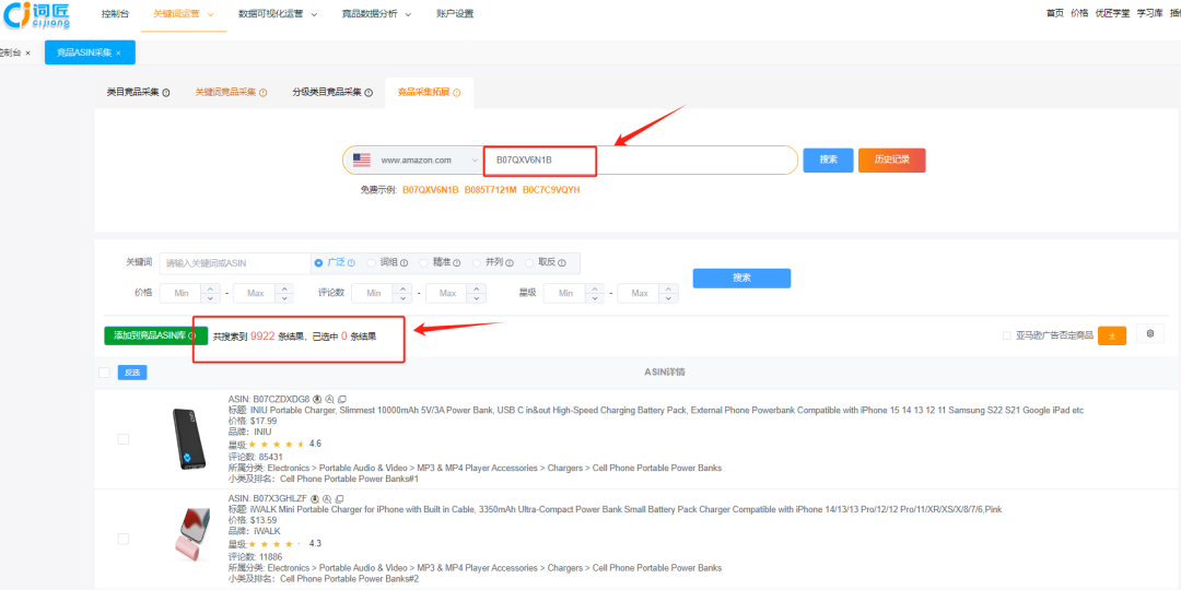 随意输入一个竞品ASIN,这里我们拿power bank类目下的一个竞品搜索,词匠会帮我们找到9922条ASIN结果,数据量非常庞大,不用再担心竞品数量少了,有非常多的ASIN可供选择!