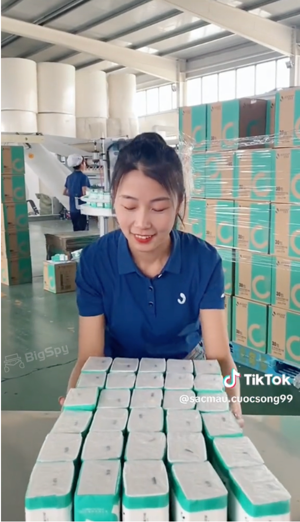 这则素材仅在越南地区投放,投放当天的展现估值就超过了2300万,TikTok评论区有接近2万条评论,大多是已经买过的客户反馈纸巾质量很好或价格很便宜,品牌口碑极佳。除此之外,从TikTok广告引流角度看,视频本身的可借鉴点包括: