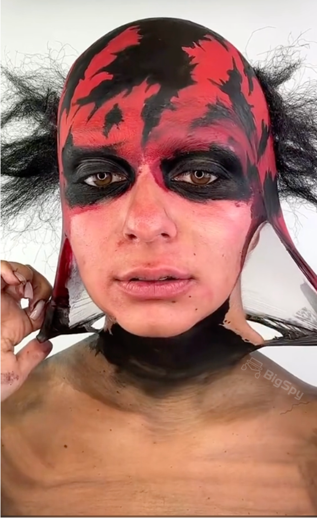 在滑动浏览瀑布流视频的时候,我们很容易被炸裂的、猎奇的画面吸引注意力;这则广告第一幕就是一个黑皮肤、红头颅的恶魔coser徒手掰自己的黑色长指甲,接着取出造型可怖的假牙,然后她拿出一瓶卸妆水,擦掉肩膀和脸部的颜料,开始卸妆,直到颜料全部被擦干净露出原本的皮肤,视频才结束。