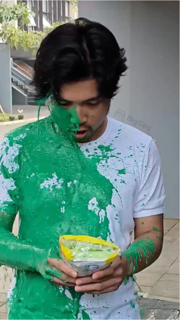 也有的TikTok广告引流在开头根本看不出它是卖什么的……比如,一个装有绿色颜料的桶滚落台阶,台阶下一个穿着白色衣服的人被淋了一身,紧接着他马上拿出手上的湿巾擦脸,擦着擦着他的脸突然变成了小孩模样……字幕出现,展示湿巾的3大卖点。广告文案显示,这是一款正在做促销活动的婴儿湿巾。