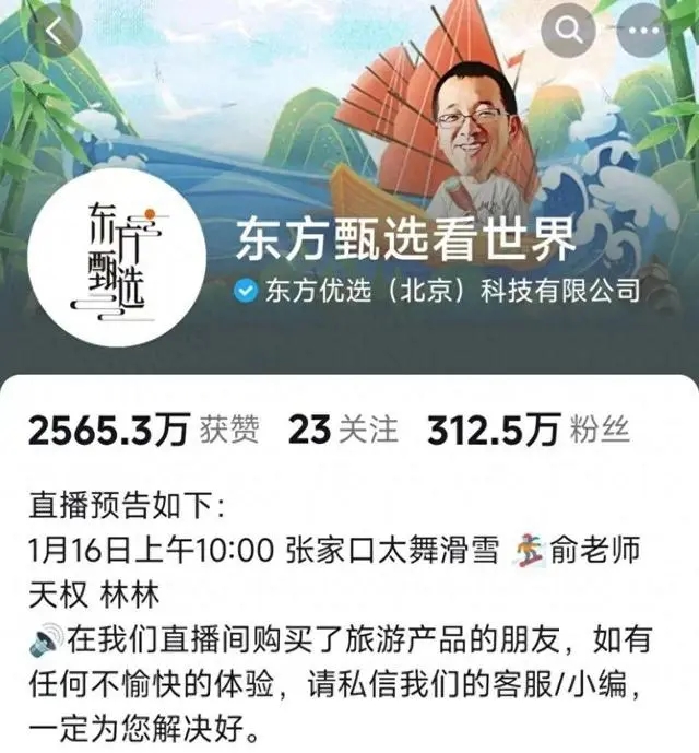 1月15日,据东方甄选旗下抖音账号@东方甄选看世界消息,此前在直播间发表不当言辞的主播天权将于16日上午在张家口太舞滑雪场直播。