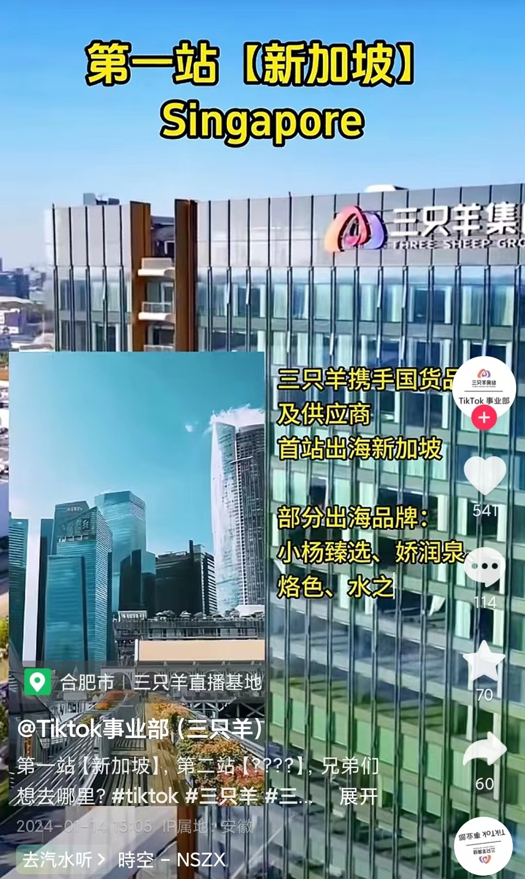 1月15日消息,据抖音账号“Tiktok事业部(三只羊)”视频显示,小杨哥公司三只羊网络近日已开启海外带货布局,第一站为新加坡,带货模式为联合海外达人赋能直播带货,带货品牌多为中国本土品牌。