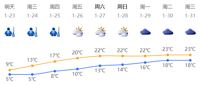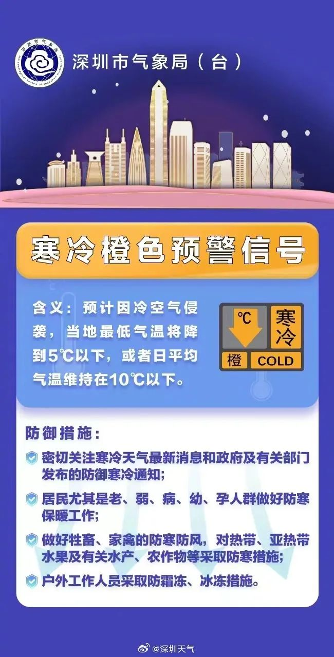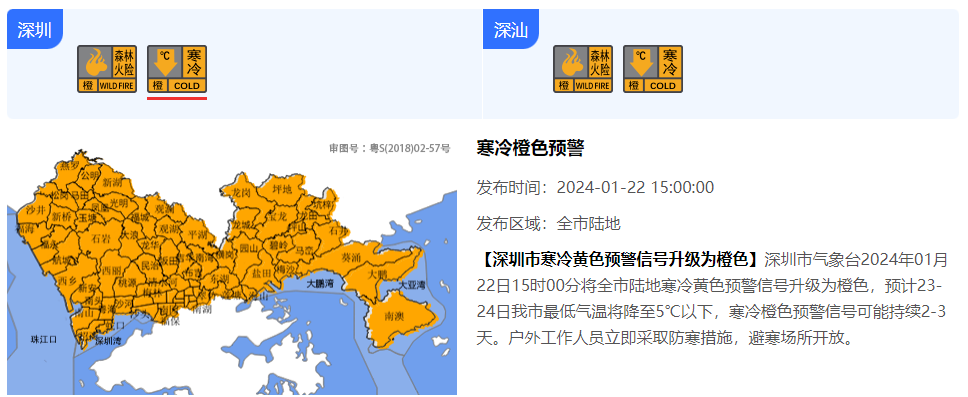 深圳市气象台2024年01月22日15时00分将全市陆地寒冷黄色预警信号升级为橙色,预计23-24日我市最低气温将降至5℃以下,寒冷橙色预警信号可能持续2-3天。户外工作人员立即采取防寒措施,避寒场所开放。