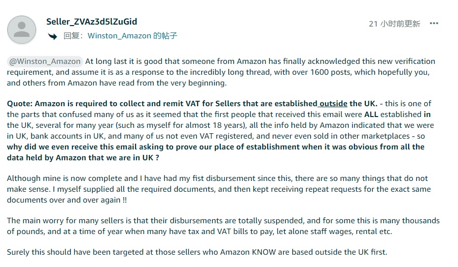 对于部分卖家来说,情况会格外严重。如果不能证明他们是英国本土的公司,那么亚马逊会要求他们缴纳2021年以来的所有增值税款,有卖家表示自己可能需要缴纳高达10万英镑的税,还有卖家称亚马逊此举可能会导致自己破产。