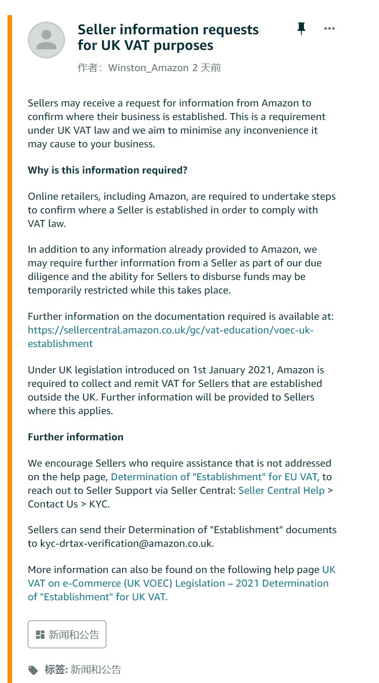 出于英国增值税目的的卖家信息请求公告 图源:亚马逊英国站公告