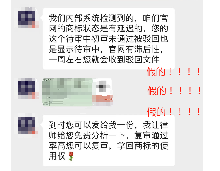 骗子在网上搜寻到商标驳回结果的商标信息之后,利用时间差联系到申请人,然后称有内部人员能够提前知道消息;同时还会诋毁你原来的代理机构多么不专业,信息多滞后等等来获取你的信任;当你一旦对原代理机构失望之后,他们就开始实施骗局的重点了;通过讲述“包过”,“保成”等一些口头承诺向申请人索要驳回复审的费用。
