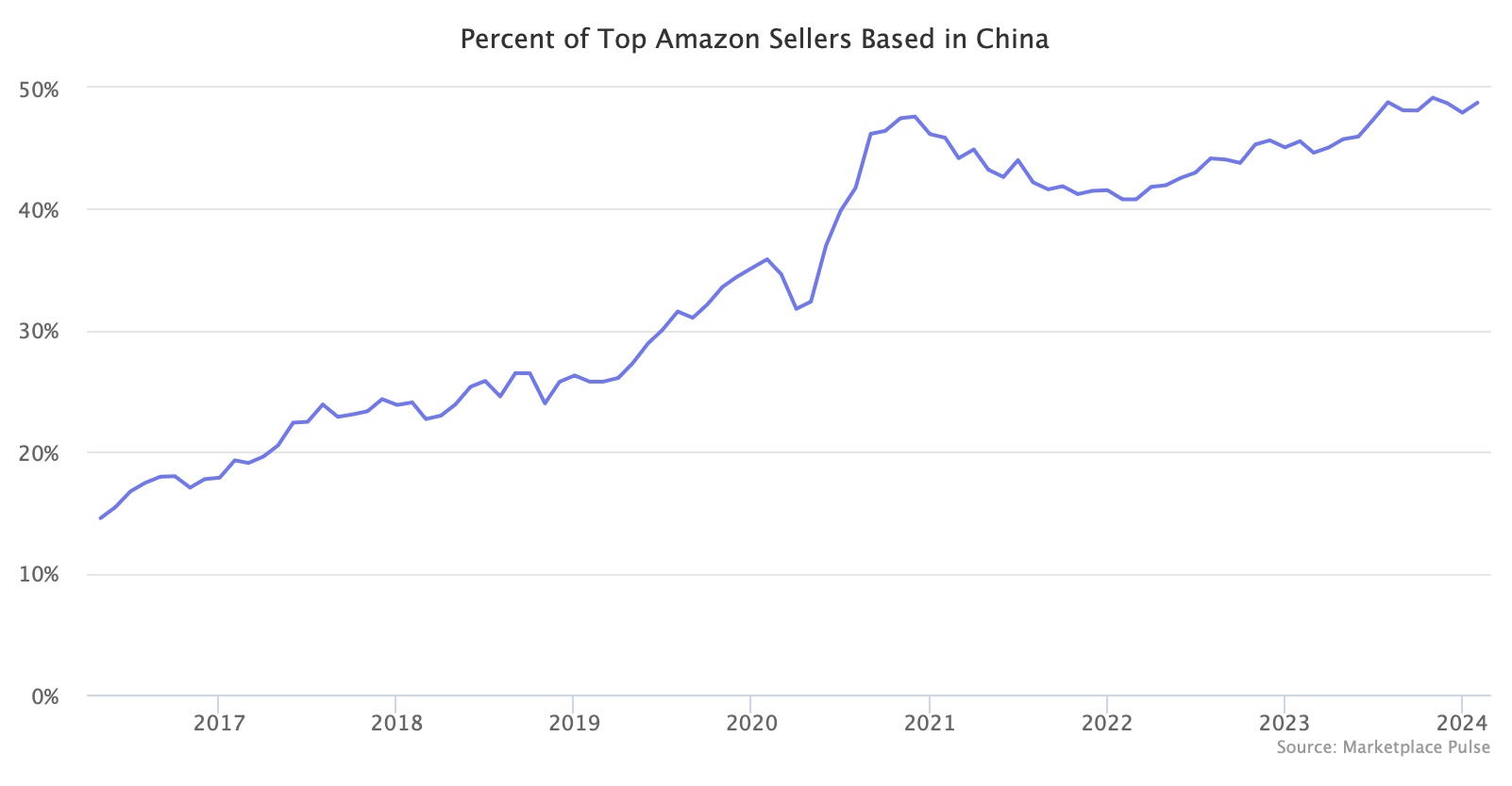 中国卖家占亚马逊top卖家的百分比 图源:Marketplace Pulse