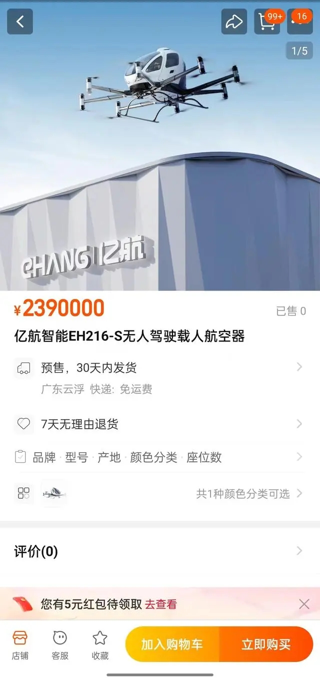 此前,据媒体报道,全球首个获得适航认证的国产自研“空中的士”亿航EH216-S在淘宝上架,标价239万元。