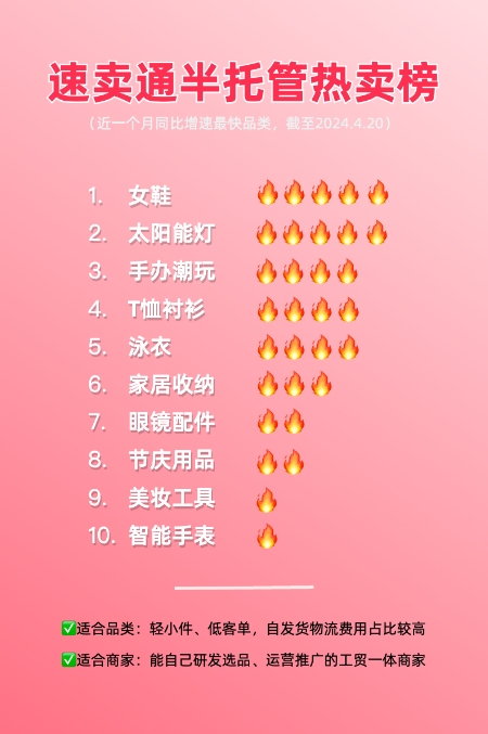 速卖通半托管热卖榜显示,近1个月增速最快的半托管品类为:女鞋、太阳能灯、手办潮玩、T恤衬衫、泳衣、家居收纳、眼镜配件、节庆用品、美妆工具、智能手表。