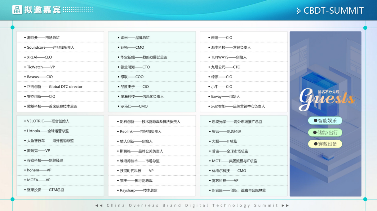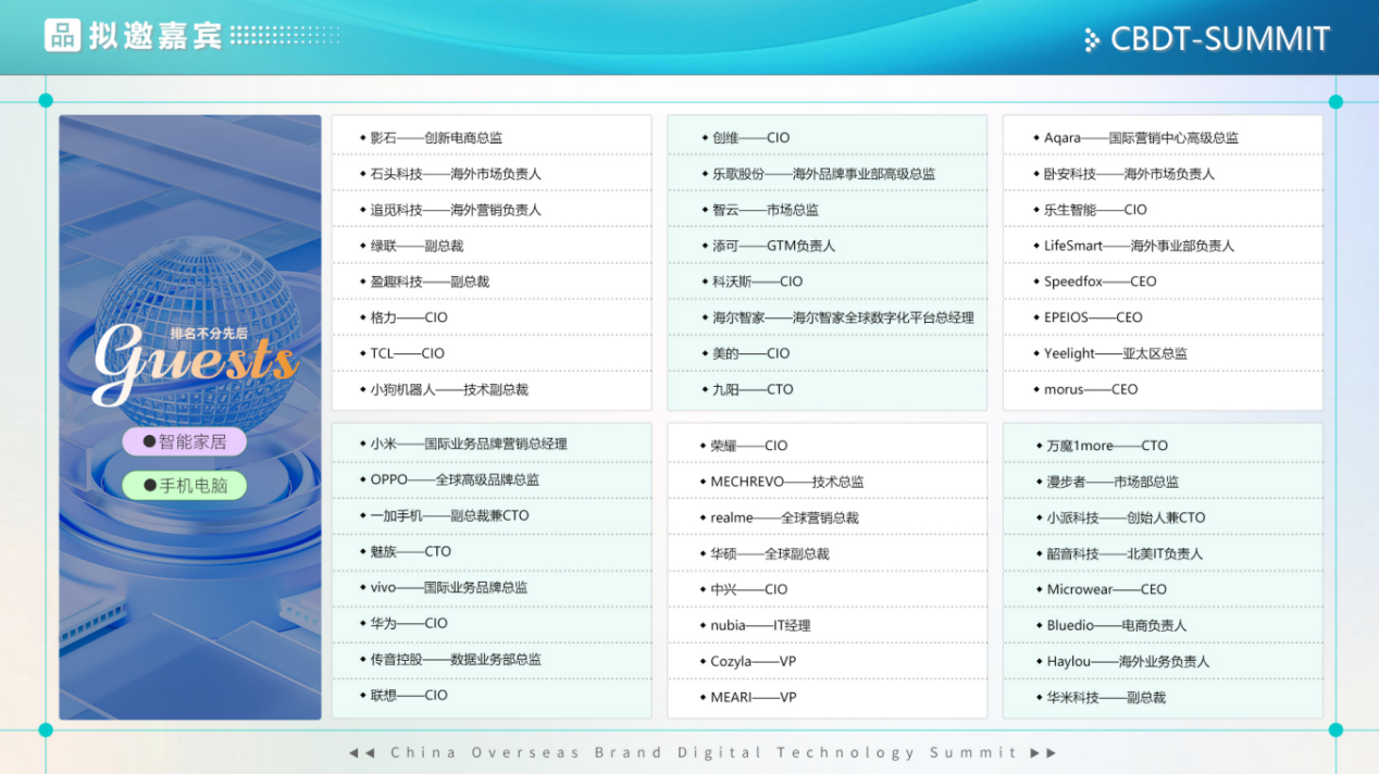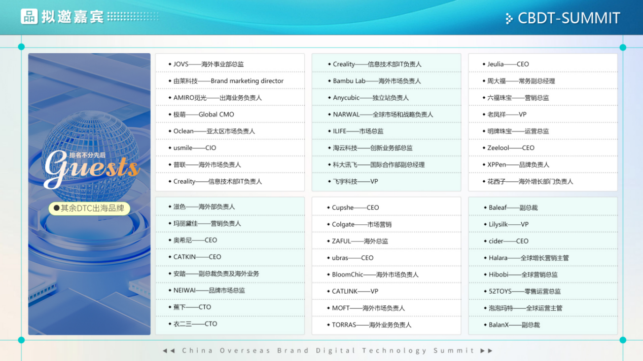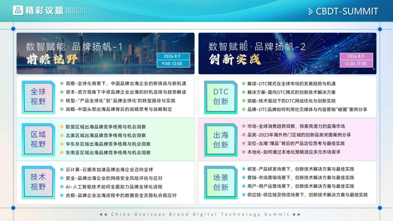 鉴于此,由技企学社发起的CBDT 2024第二届中国出海品牌数字科技峰会全面升级,将于2024年8月9日在中国深圳举办。峰会以“数智赋能·品牌扬帆”为主题,届时将汇聚220+DTC品牌,包括消费电子、智能家居、智能穿戴、机器人等行业出海企业CIO、CTO、及国际市场负责人。共同探讨在数字化、全球化的时代背景下,中国品牌如何更好地进行国际化布局,帮助企业把握数字化时代的出海机遇,加速品牌的全球化进程。