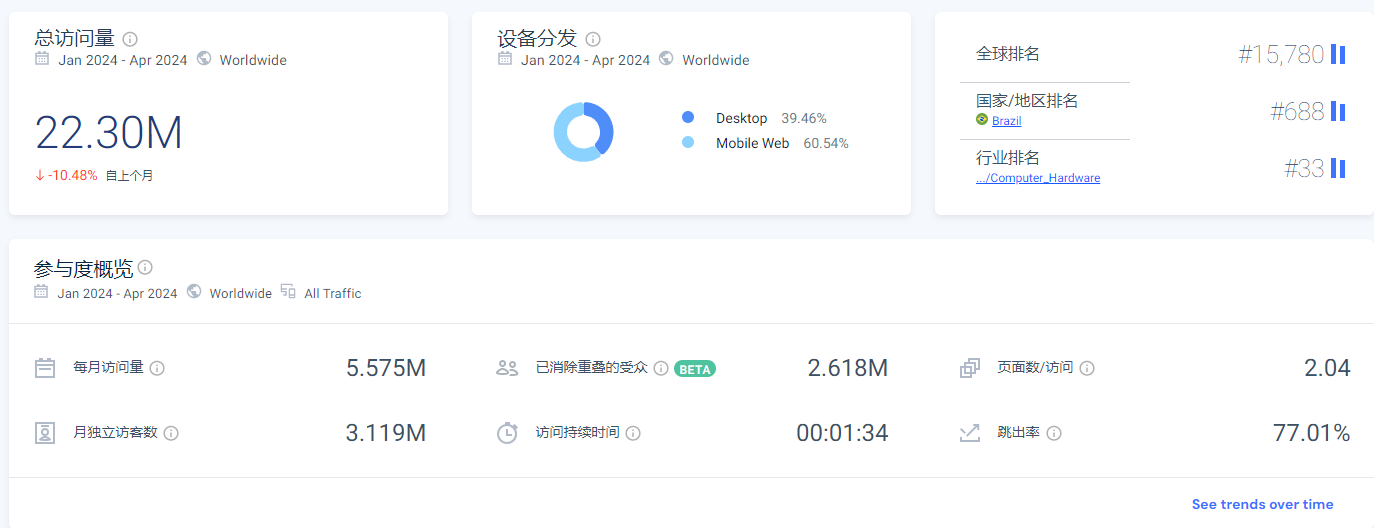 在2024年1月至4月期间,总访问量约为2200万,月访问量达550万,在计算机硬件领域排名第33,这充分彰显了其在游戏和技术领域的权威地位。