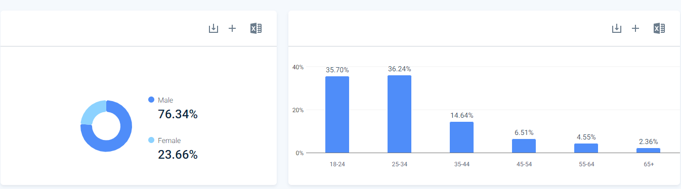 符合人群中,男性占76%,女性占23%,主要年龄段为25-34岁,行业分布主要集中在游戏机和配件以及计算机电子技术。