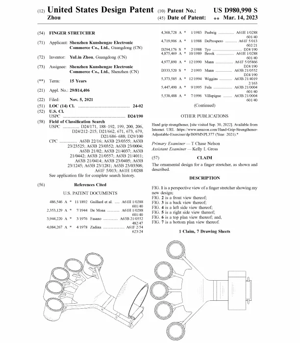 品牌方Shenzhen Kunshengze Elec-tronic Commerce Co. Ltd.早在去年9月初就起诉过外观专利侵权,涉及名为涉及名为Finger stretcher的美国外观专利,专利号USD980990S: