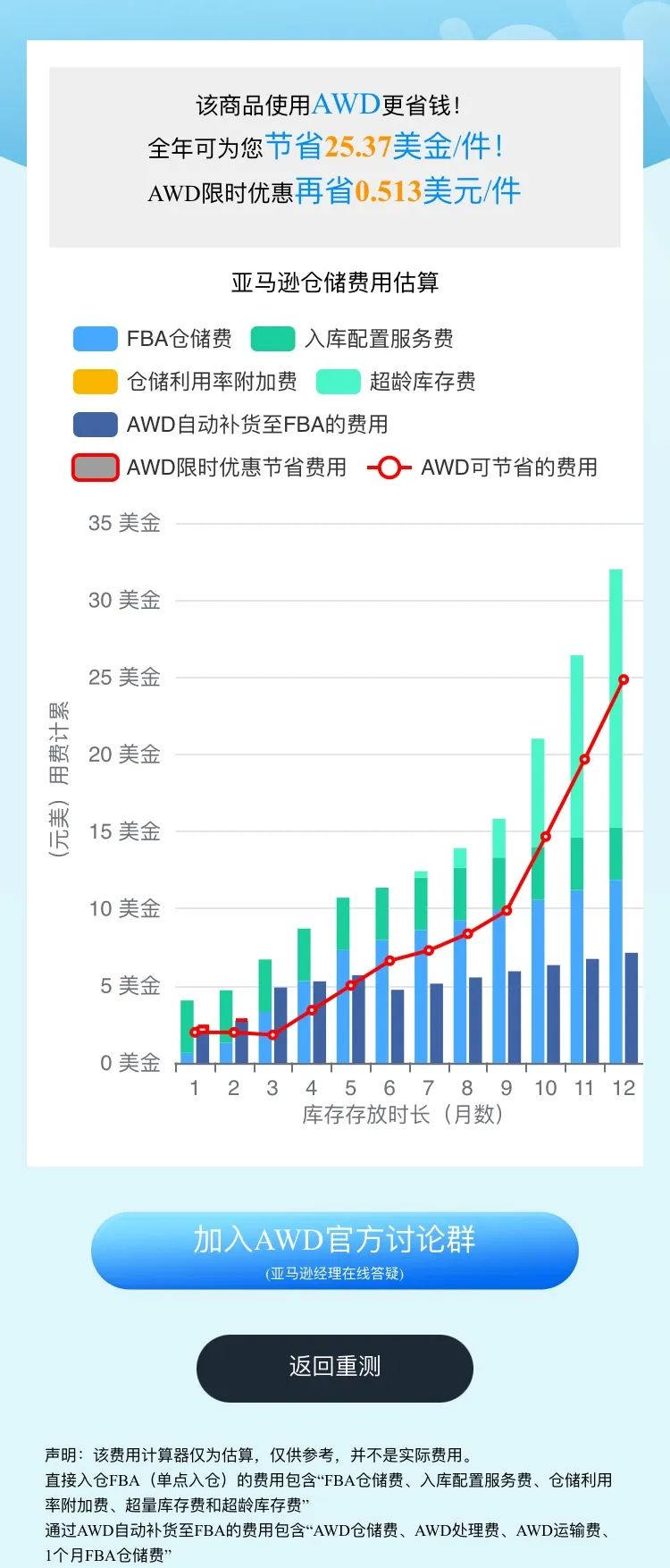 结果显示:该商品无论需要存放多久,都是右侧柱状图更低,即入库AWD更省钱。左侧柱状图是直接入库FBA的费用,在最小货件拆分的情况下,入库配置服务费高达3.4美元/件,占了很大比例。该商品售价为69.99美元/件,入库配置服务费就占到4.86%!而使用AWD自动补货至FBA,是不会额外收取入库配置服务费的。此外,AWD在年底旺季无调价,旺季期间AWD仓储费也仅收取0.48美元/立方英尺/月,相较于同期FBA仓储费低80%。如果需要备货一年的话,该商品入库AWD可节省25.37美元/件!
