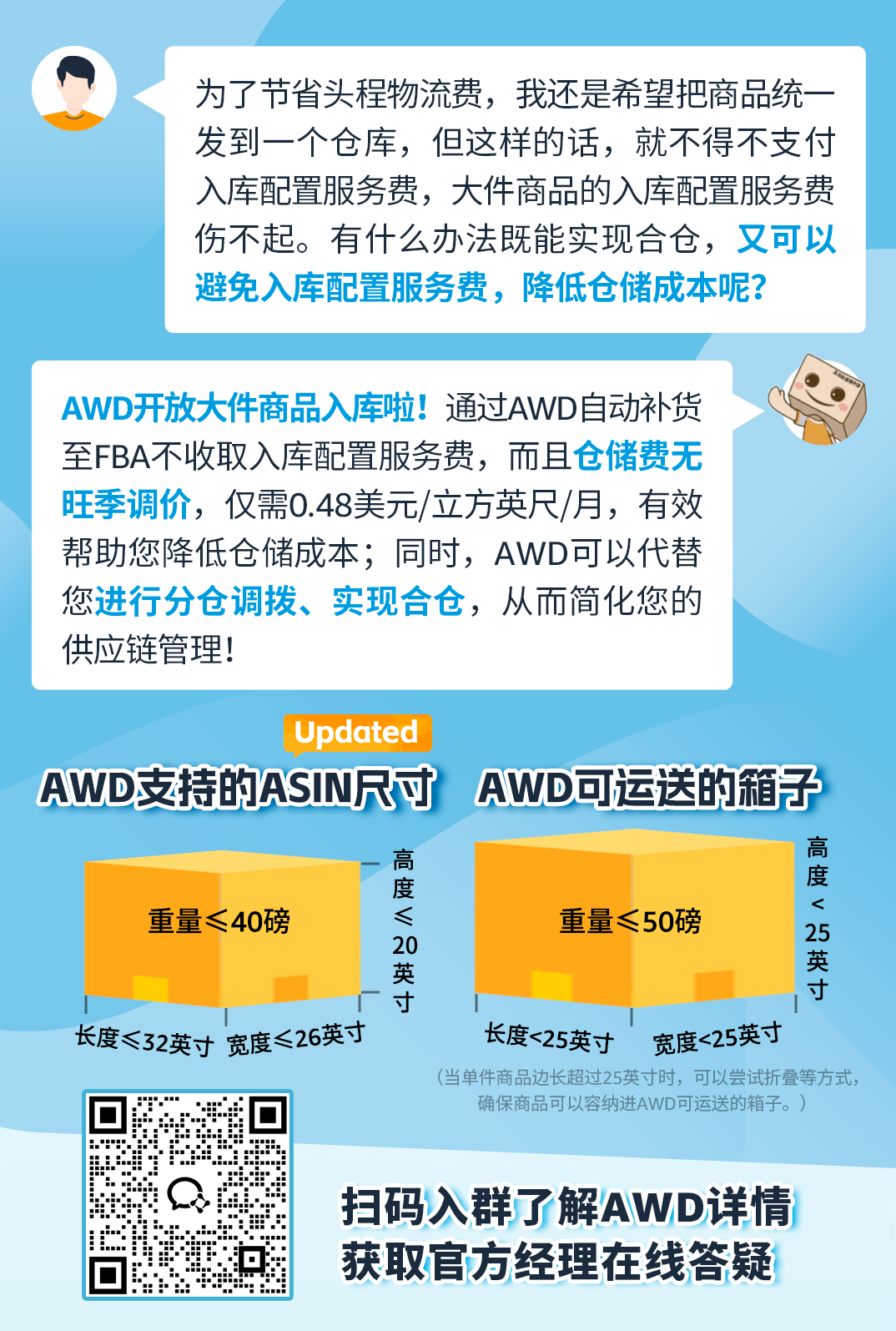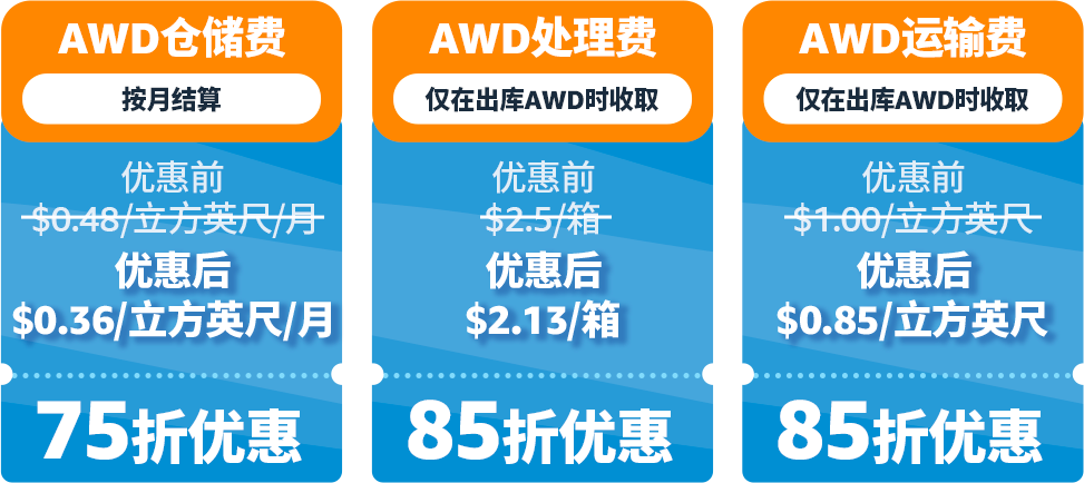 亚马逊贴心推出AWD限时优惠,2024年7月1日至9月30日(太平洋时间),活动期间产生的所有AWD仓储费自动享受75折优惠,仓储费低至0.36美元/立方英尺/月;处理费和运输费自动享受85折优惠,不限制头程物流承运商,您不用更换合作中的货代!