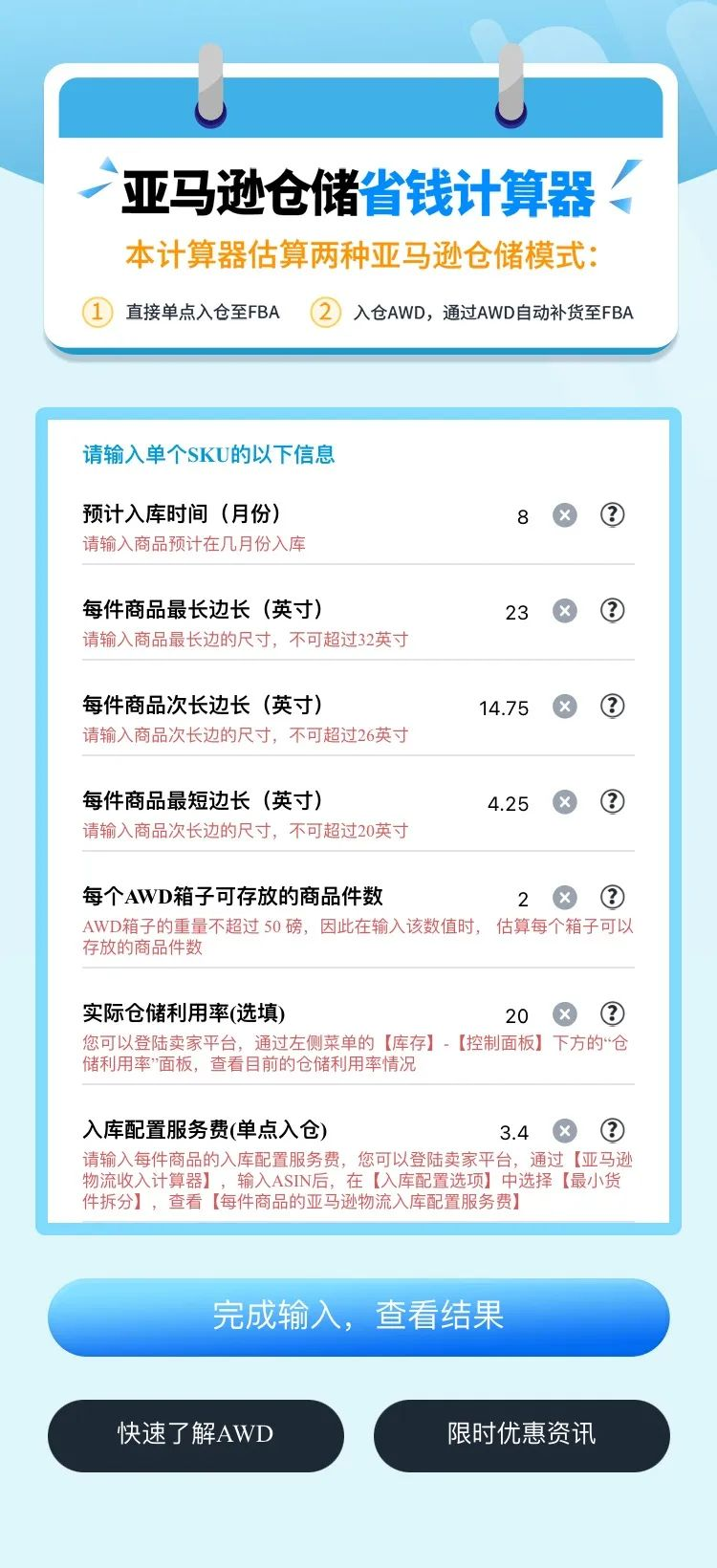 打开“亚马逊仓储省钱计算器”,输入该商品的相关信息: