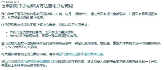 实际上,亚马逊较早之前就已有”仅退款“服务,可谓“仅退款”的鼻祖。但在此之前并未明确哪些商品适用,而是仅凭亚马逊平台自行判断商品是否符合“仅退款”的要求。如今,亚马逊进一步明确了商品要求,并把美国站的25美金改为75美金,扩大了“仅退款”的商品范畴。“仅退款”有利有弊,能提高用户体验,但退货率高且利润低的类目一旦被“薅羊毛党”盯上,损失可能会更大。 据雨果跨境了解,亚马逊美国站于8月14日发布一则”使用退款不退货解决方法简化退货流程“的通知。通知称,亚马逊物流退款不退货解决方案是一项新计划,通过为买家提供全额退款,并且买家无需退回商品,从而帮助卖家简化退货流程。 卖家注册亚马逊物流退款不退货解决方案后,主要可获得两方面的权益,一是降低与退货相关的费用,为买家提供更多便利;二是简化退货管理流程,无需处理实际退回的商品。 据了解,以往在默认情况下,买家需要将商品退回到亚马逊运营中心,亚马逊运营中心会评估其可售性。如果卖家为库存注册“亚马逊物流退款不退货解决方案”后,可以在向买家申请退款后允许他们保留商品,以节省高退货率、买家退货处理、仓储和移除产生的费用。 亚马逊表示,退款不退货解决方案的商品需符合法律、安全和法规指南,不符合亚马逊退款不退货解决方案要求的商品主要包括: ①危险品 ②召回商品 ③礼品卡 ④重型大件商品 ⑤不可退货的商品 ⑥平均售价高于75美金的商品 另据雨果跨境了解,只有信用良好的卖家(由亚马逊定义且由亚马逊自行决定)才能注册亚马逊物流退款不退货解决方案。与此同时,亚马逊会设置一些限制条件,只有那些没有滥用历史记录的买家才能向卖家申请“退款不退货解决方案”。目前这些”限制条件“尚不明确。因此,如果买家不符合特定条件,无法使用”仅退款“,货物依然会像往常一样退回至亚马逊运营中心。 从卖家提供的截图看,卖家已经可以在后台为商品设置是否参与退款不退货解决方案。默认情况下,卖家的所有库存商品是禁用退款不退货解决方案。当然,卖家也可以选择”为选定ASIN禁用退款不退货解决方案“、”为所有ASIN启用退款不退货解决方案“、”为选定ASIN启用退款不退货解决方案“。 据悉,早在2017年,亚马逊就已将“退款不退货服务”正式写入售后政策中,但其更早些时候就已开始在实践尝试,可能是早期实践获得了一定效果,才将之正式写入售后政策中。对于“仅退款”,亚马逊其实一直在低调的测试和调整。 2021年,亚马逊美国站对退货政策做了一次修改:销售价值低于25美金的订单商品,必须向亚马逊提供一个有效的美国境内退货地址。在退货请求符合要求时,亚马逊将使用此地址为买家生成预付费退货标签。如果未提供美国退货地址,亚马逊将为符合要求的退货向买家发放退款,并且不要求退回商品(退款不退货)。 ”说真的,其实亚马逊也很流行仅退款,我才发现很多退款我压根没同意,直接就是仅退款不退货了。“一位自发货卖家晒出后台截图。 此外,亚马逊今年推出的低价商店项目中也有“仅退款”服务,其售后规则是:低于3美元的低价产品,在15天内可以退款不退货。这一举动被认为是亚马逊仅退款政策的一次“升级”,以及针对卖家和买家的一次测试。 近几年,国内的拼多多、京东、淘宝等电商平台先后都推出”仅退款“的售后条款,甚至部分跨境B2B平台也跟风推出”仅退款“服务。但“仅退款”政策有利也有弊,一直以来颇有争议,对卖家而言是把双刃剑。 对于客单价较低的商品来说,“仅退款”可以节省退换货导致的物流和人工成本,同时有效改善客户体验,增强二次营销和品牌传播的概率。 然而,这一政策也带来了不少问题。在实际操作中,“仅退款”意味着商品白白送出,而且可能会吸引大量“白嫖党”利用这一政策牟利,增加退货率,影响店铺运营。 对于退货问题,亚马逊方面的建议是,对于价格较低或者运费较高的商品,为其提供全额退款而不要求退货可能会更加划算。卖家可设置规则,以便为符合条件的退货触发自动退款,并即时关闭退货请求。 如何避免“恶意仅退款”,资深卖家敏哥表示,如果遇到太过分的恶意买家,可以在后台投诉,举报滥用亚马逊政策的行为,或者找客服帮忙,开Case把恶意用户的订单和退款情况全部列出来,让官方处理。对于客单价较高的产品,要设置退货地址,比如退回海外仓。此外,还要在退货设置中开启退货商品授权(RMA),只有经过卖家的同意,退货才可以执行,否则产品可能会被白白薅羊毛。在设置好RMA后,如果遇到买家故意退款不退货的情况,卖家可以直接向亚马逊平台申请赔偿。
