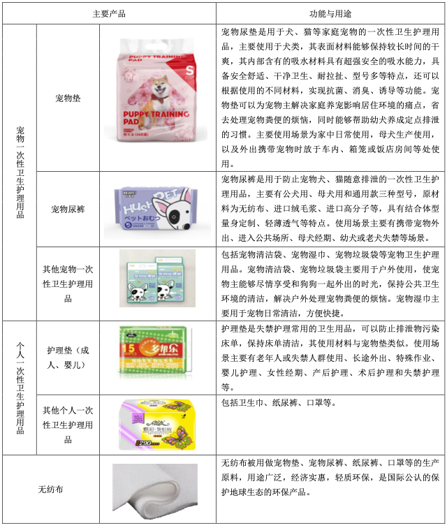 依依股份总部位于天津,是国内卫生护理用品出口龙头企业之一,在宠物卫生护理用品及个人卫生护理用品的生产、销售方面有多年的经验,销售覆盖美国、日本、意大利、英国、巴西、韩国等近40个国家和地区。目前,公司主营业务为一次性卫生护理用品及无纺布的研发、生产和销售,其中, 一次性卫生护理用品包括宠物卫生护理用品和个人卫生护理用品。宠物卫生护理用品包括宠物垫、宠物尿裤、宠物清洁袋、宠物湿巾、宠物垃圾袋等,个人卫生护理用品包括卫生巾、护理垫、纸尿裤、口罩等。