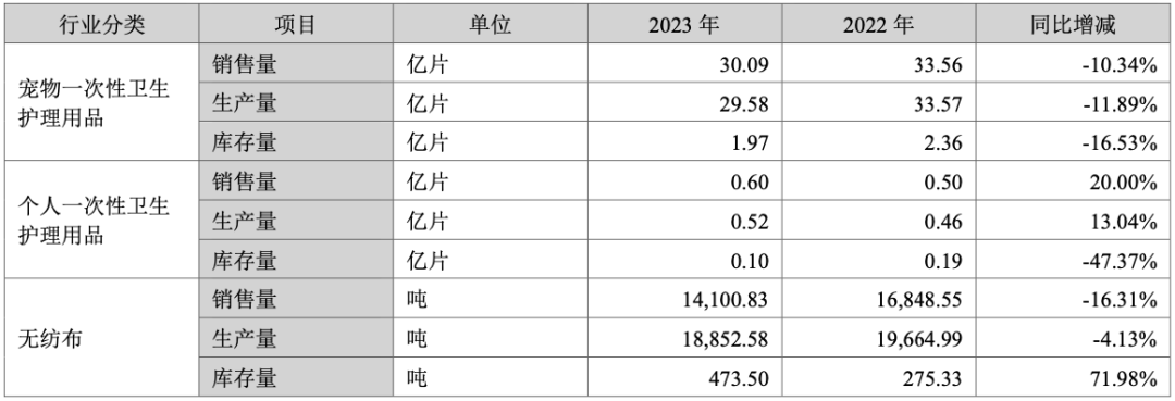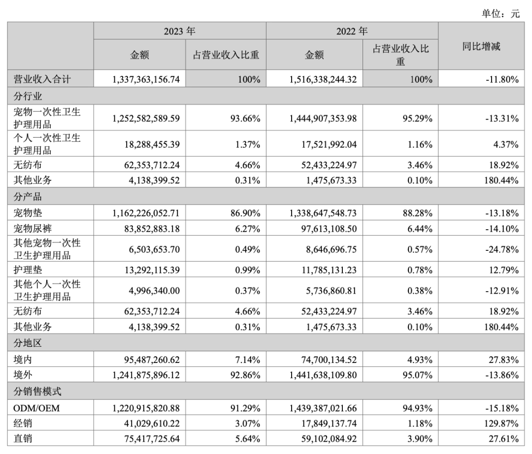 若按收入比重来看,宠物垫是公司最重要的产品,其次为宠物尿裤。2023年,宠物垫和宠物尿裤收入分别为11.62亿元和8385万元,占公司营业收入比重分别为86.90%和6.27%。